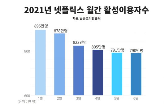 하지만 최근 들어 이용자 이탈이 가속화되고 있다. 닐슨코리안클릭에 따르면 넷플릭스의 MAU는 지난 1월 895만명으로 정점을 찍은 뒤, 지속적으로 하락 중이다(안드로이드·iOS, 7~79세 이용자 기준). ▷2월 878만명 ▷3월 823만명 ▷4월 805만명 ▷5월 791만명 ▷6월 790만명으로 감소했다. 4개월 만에 이용자가 100만 명이나 이탈한 것이다.