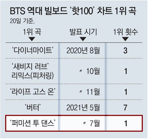 BTS가 5개 곡을 차트 1위에 올려놓은 속도는 팝의 황제 마이클 잭슨 이후 최단 기록이다. BTS는 ‘다이너마이트’ 이후 10개월 2주 만에 ‘새비지 러브’ 리믹스(피처링 참여), ‘라이프 고스 온’, ‘버터’, ‘퍼미션 투 댄스’를 잇달아 발표해 1위에 올려놓았다. 마이클 잭슨은 1987년부터 1988년 사이 약 9개월 2주 동안 ‘배드(Bad)’ 앨범에서 발표한 다섯 곡을 빌보드 정상에 올려놓았다. 역대 최단 기록을 가진 가수는 1964년 6개월 동안 다섯 곡으로 핫100 차트에서 1위를 차지한 영국의 밴드 ‘비틀스’다.