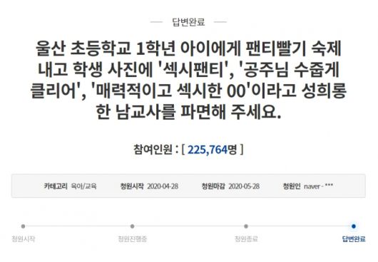 청와대 게시판에는 A씨를 파면해 달라는 글이 올라왔고, 1개월 만에 22만여 명의 동의를 얻었다. 결국 울산시교육청은 지난해 5월 징계위원회를 열어 A씨를 파면했다.