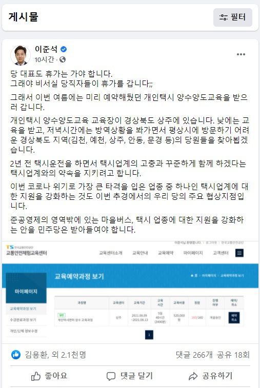 그는 “그래서 이번 여름에는 미리 예약해뒀던 개인택시 양수양도교육을 받으러 갑니다”면서 “개인택시 양수양도교육 교육장이 경상북도 상주에 있습니다”고 말했다.