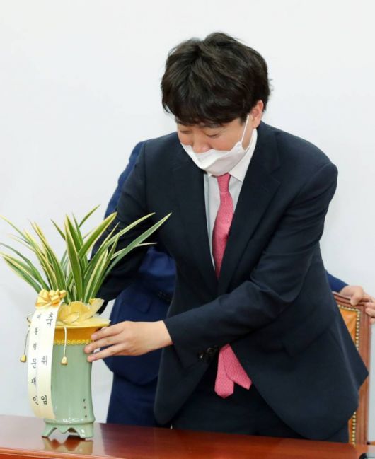 [서울=뉴시스]최동준 기자 = 국민의힘 이준석 대표가 16일 서울 여의도 국회에서 이철희 청와대 정무수석으로부터 전달 받은 문재인 대통령의 축하난을 두고 있다. (공동취재사진) 2021.06.16. photo@newsis.com |