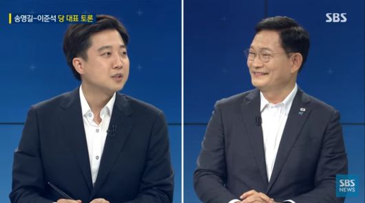 이준석 국민의힘 대표(왼쪽)와 송영길 더불어민주당 대표가 21일 SBS 주영진의 뉴스브리핑에서 TV토론을 하고 있다. [SBS뉴스 유튜브 캡쳐] |