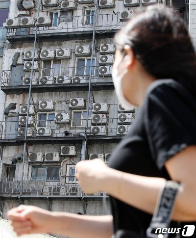 (서울=뉴스1) 김진환 기자 = 21일 서울의 한 건물 외벽에 설치된 에어컨 실외기가 열기를 내뿜고 있다. 역대급 폭염이 예고된 이번주 전력수급 대란에 대한 우려가 커지고 있다. 산업통상자원부는 '여름철 전력수급 전망 및 대책'을 통해 이번주 전력 예비율이 4.2%까지 내려갈 것으로 예측했다. 전력예비율이 3.2%(241만kW)까지 떨어졌던 2013년 이후 9년만에 가장 낮은 수치다. 2021.7.21/뉴스1 |
