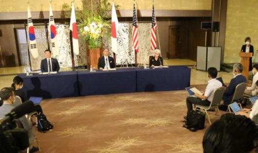 21일 오전 일본 도쿄 외무성 이쿠라공관에서 최종건 한국 외교부 1차관, 웬디 셔먼 미국 국무부 부장관, 모리 다케오 일본 외무성 사무차관이 참석한 가운데 한미일 외교차관 공동 기자회견이 열리고 있다. [이미지출처=연합뉴스] |