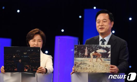 김두관 더불어민주당 대선 경선 예비후보(오른쪽)과 추미애 예비후보가 지난 3일 서울 여의도 KBS에서 열린 첫 합동 토론회에서 '내 인생의 한 장면' 사진을 공개하고 있다. 2021.7.3/뉴스1 |