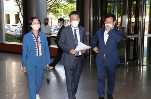 국민의힘 이영(왼쪽부터), 최승재, 김형동 의원이 자영업자 시위 단속과 관련해 22일 서울 서대문구 경찰청을 항의 방문하고 있다. [이미지출처=연합뉴스] |