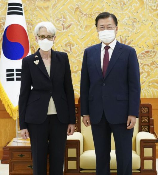 청와대는 문 대통령이 이날 오전 11시 셔먼 부장관을 접견하고 북한 문제와 한미동맹, 지역 및 글로벌 이슈에 대해서 대화를 나눴다고 밝혔다.