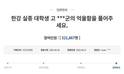 한편, 청원인은 지난 5월28일 게재한 청원글에서 고인과 고인의 부모님의 억울함을 풀어달라고 촉구했으며, 해당 글에는 총 52만1867명이 동의했다.