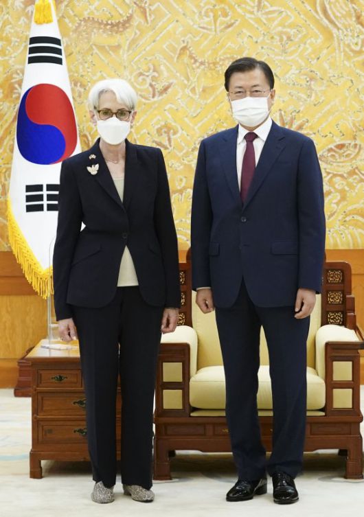 문 대통령은 셔먼 부장관의 취임 후 첫 방한을 환영하며, "셔먼 부장관은 국무부 요직을 두루 거치며 한반도와 동북아 정세에 정통한 베테랑 외교관으로 알고 있다. 기대가 크다"고 말했다. 셔먼 부장관은 문 대통령의 접견에 사의를 표명하고 "한국에 오랜만에 오니 제2의 고향에 온 느낌"이라며 "한국은 미국의 본격적인 파트너이자 진정한 글로벌 파트너"라고 화답했다.