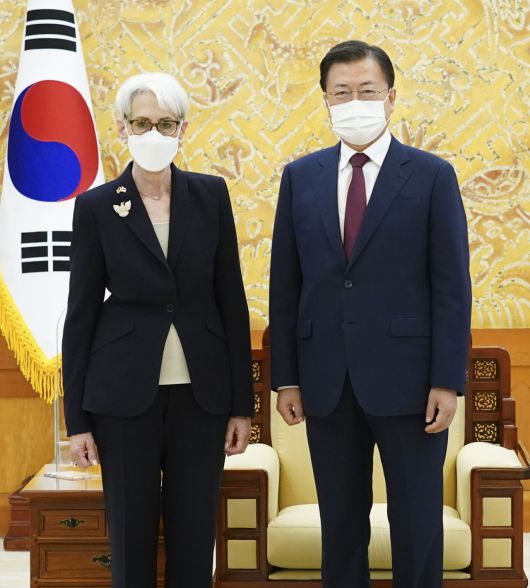 문 대통령은 셔먼 부장관의 취임 후 첫 방한을 환영하며, “셔먼 부장관은 국무부 요직을 두루 거치며 한반도와 동북아 정세에 정통한 베테랑 외교관으로 알고 있다. 기대가 크다”고 했다. 또 “바이든 대통령은 ‘미국의 귀환’, ‘외교의 귀환’을 강조했는데, 블링컨 장관과 셔먼 부장관 두 분의 탁월한 외교관으로 짜여진 국무부 진용을 보면 ‘외교관의 귀환’도 추가해야 할 것 같다”면서, “한미 동맹과 한반도 평화를 위해 많은 역할과 기여를 해 주기를 바란다”고 말했다.
