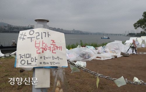 지난 5월27일 서울 반포한강공원 수상택시 승강장 인근에 숨진 손정민씨를 추모하는 글과 물품들이 가득 놓여 있다. 강윤중 기자 |