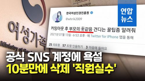 (서울=연합뉴스) 여성가족부 산하 한국여성인권진흥원이 공식 사회관계망서비스(SNS)에 욕설을 올려 물의를 일으킨 사건에 대해 여성가족부가 특별감사를 진행 중인 것으로 22일 확인됐습니다.