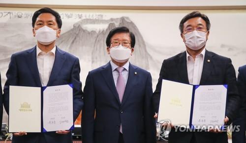 추경안ㆍ상임위원장 배분 합의문 들어보이는 양당 원내대표 |