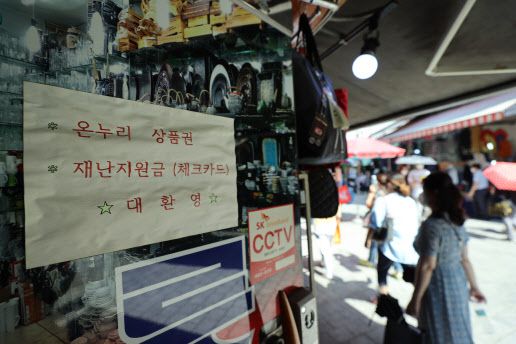 고소득자를 제외하고 전체 국민의 88%가 1인 기준으로 25만원의 재난지원금을 받게 된다. 사진은 이날 오후 서울 중구 남대문 시장장의 한 매장에 재난지원금 사용 가능 안내문. (사진=연합뉴스) |