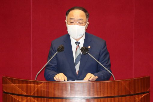 홍남기 부총리 겸 기획재정부장관이 24일 새벽 서울 여의도 국회에서 열린 제389회 국회(임시회) 제3차 본회의에서 2021년도 제2회 추가경정예산안 의결을 앞두고 정부측 의견을 말하고 있다. (사진=연합뉴스) |