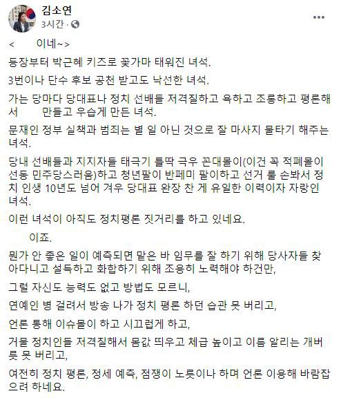 오늘(25일) 김 변호사는 자신의 페이스북에 "등장부터 박근혜 키즈로 꽃가마 태워진 녀석, 3번이나 단수 후보 공천 받고도 낙선한 녀석"이라고 평하며 그가 "가는 당마다 당 대표나 정치 선배들을 저격하고 욕하고 조롱하고 평론해서 우습게 만들었다"고 적었다.