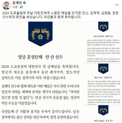 문 대통령은 이날 SNS를 통해 공개한 축전에서 전날 대한민국에 첫 금메달을 안긴 김제덕·안산 선수에게 "양궁의 새로운 종목에서 올린 쾌거"라며 "국민들께 큰 기쁨과 용기를 주셔서 감사드린다"고 밝혔다.