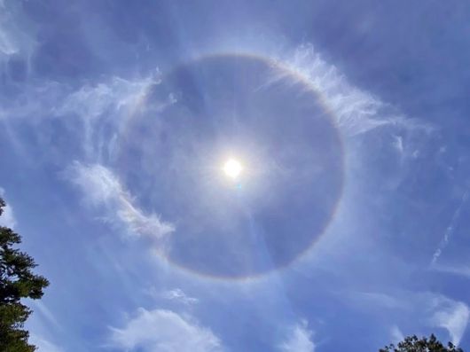 ‘햇무리’라고도 하는 헤일로는 태양 주변에 둥근 모양의 무지개가 나타나는 현상을 말한다. 헤일로는 주로 햇볕이 높은 곳에 있는 구름인 권층운을 통과할 때 생긴다./사진=@yuhmari 트위터 |