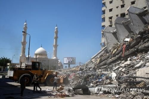 가자지구서 공습 폐허 건물 잔해 치우는 중장비 |