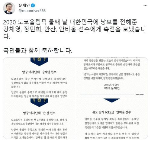 (서울=연합뉴스) 김범현 기자 = 문재인 대통령은 26일 도쿄올림픽 양궁 여자단체전에서 금메달을 거머쥔 강채영·장민희·안산 선수, 유도 남자 66kg급에서 동메달을 획득한 안바울 선수에게 각각 축전을 보내 축하했다.