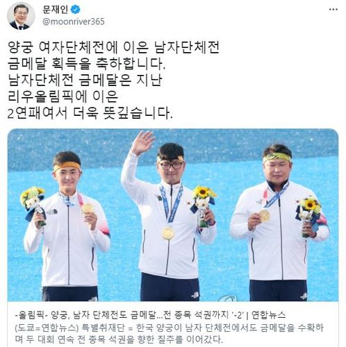 문 대통령은 이날 SNS에 올린 글을 통해 "남자단체전 금메달은 지난 리우올림픽에 이은 2연패여서 더욱 뜻깊다"며 이같이 밝혔다.