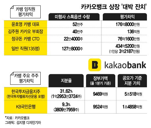 카카오뱅크의 상장은 임직원과 주주에겐 '대박 잔치'의 시작이다. 공모가가 3만9000원으로 정해지면서 주식매수선택권(스톡옵션)을 행사할 수 있는 카뱅 임직원들은 총 900억원의 평가차익을 본다. 카뱅 주주들도 수천억원의 지분 평가이익을 기대한다.