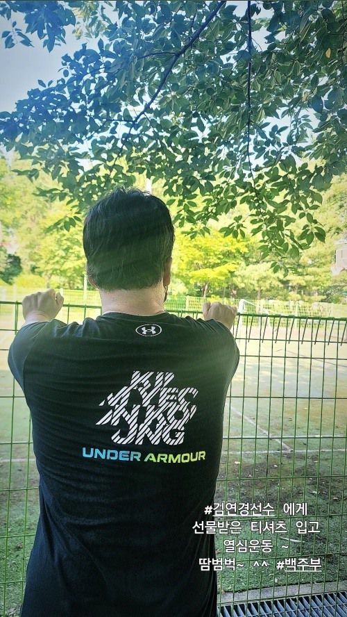 이번에 공개된 사진에는 배구선수 김연경이 선물한 티셔츠를 입고 운동을 하러 나온 외식사업가 백종원의 모습이 담겨 있다.