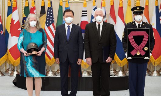 문재인 대통령이 한국 국가수반으로는 처음으로 유엔군 참전용사에게 훈장을 수여했다. 문 대통령은 “정부는 ‘참전으로 맺어진 혈맹의 인연’을 돼시기며 참전용사들의 희생과 헌신에 보답하겠다”고 밝혔다.