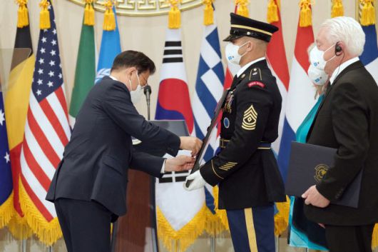 문 대통령은 두 참전용사의 무훈을 소개한 뒤 “그동안 ‘유엔군 참전의 날’에 국무총리가 수여했는데, 오늘은 제가 역대 대통령 최초로 영광스러운 임무를 수행하게 됐다”며 “자유와 평화를 수호한 두 분의 정신이 우리 국민의 마음속에 영원히 기억되길 바란다”고 했다.