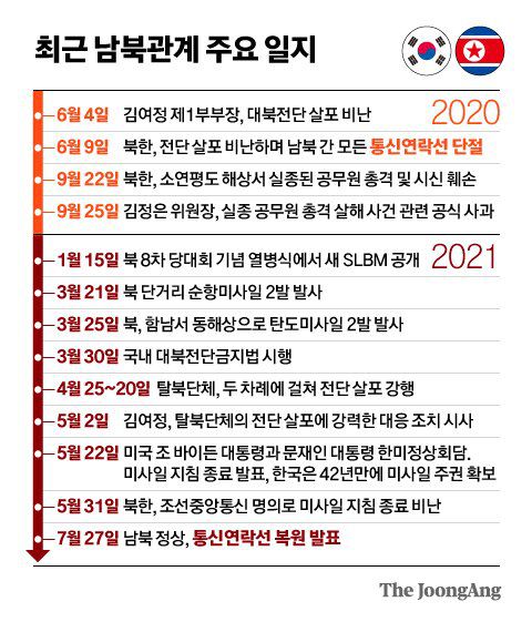 김 위원장이 직접 나선 건 그만큼 복원에 부여하는 무게감이 크다는 뜻으로 볼 수 있다. 조 바이든 미국 행정부와의 북핵 협상 과정에서 남북 관계를 레버리지로 활용하려는 의도가 반영된 결과일 수 있다는 분석도 그래서 나온다.