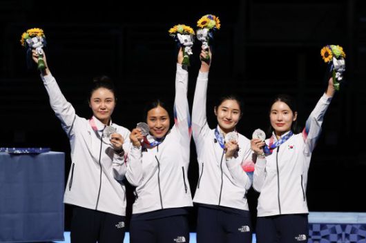 펜싱 여자 에페 대표팀 최인정, 강영미, 이혜인, 송세라가 27일 일본 지바 마쿠하리 메세B홀에서 열린 도쿄올림픽 펜싱 여자 에페 단체전 시상식에서 은메달을 보여주고 있다. 2021.7.27/뉴스1 © News1 이재명 기자 /사진=뉴스1 |
