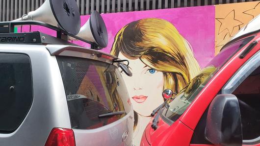 서점 개점 이전인 오늘 오전 8시 30분에도 우파 성향 유튜버들은 일찌감치 차량 3대를 벽화 앞에 나란히 주차해 그림을 가려놓고 확성기로 '몽키매직' 등 노래를 틀어놨습니다.