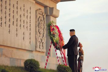 김정은 북한 국무위원장이 6·25 전쟁 정전협정 체결 기념일(‘전승절’) 68주년을 맞아 28일 우의탑에 헌화했다고 조선중앙통신이 29일 보도했다. [연합] |