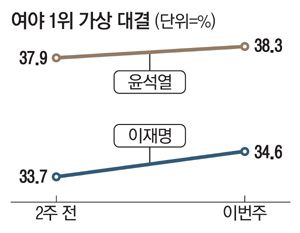 29일 매일경제·MBN이 알앤써치에 의뢰해 실시한 여론조사에 따르면 이재명·윤석열 두 여야 후보 간 양자대결을 가정했을 때 이 지사는 34.6%, 윤 후보는 38.3%를 얻었다. 지난 1일 발표된 조사에서 두 사람 격차는 6.7%포인트까지 벌어졌지만, 15일 조사에선 4.2%포인트로 좁혀졌고, 이번엔 3.7%포인트까지 줄어들었지만 이 지사가 여전히 '역전'하지는 못하고 있는 것이다. 윤 후보가 '주 120시간' '민란' 등 각종 실언 논란에 시달렸음에도 여당 주자들이 좀처럼 따라잡지 못하는 상황이다.