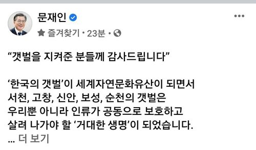 (서울=연합뉴스) 임형섭 기자 = 문재인 대통령은 30일 '한국의 갯벌'이 유네스코 세계유산으로 등재된 것과 관련해 "많은 분의 지혜와 희생과 필사적 보호가 있었다"며 "갯벌을 지켜준 분들께 감사드린다"고 말했다.