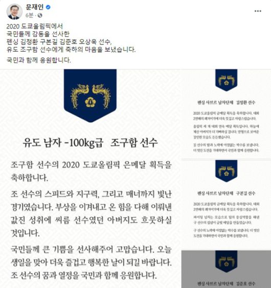 문 대통령은 먼저 조구함 선수에게 "2020 도쿄올림픽 은메달 획득을 축하한다"라며 "조 선수의 스피드와 지구력, 그리고 매너까지 빛난 경기였다. 부상을 이겨내고 온 힘을 다해 이뤄낸 값진 성취에 씨름 선수였던 아버지도 흐뭇하실 것"이라고 했다.