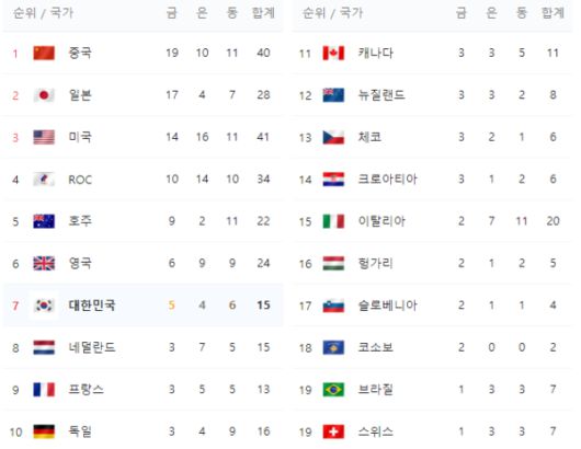 7위는 금메달 5개, 은메달 4개, 동메달 6개인 대한민국이다.