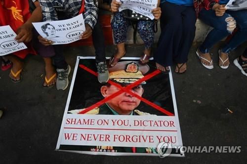 시위대가 민 아훙 흘라잉 최고사령관의 포스터를 짓밟는 모습. 2021.2.11 |
