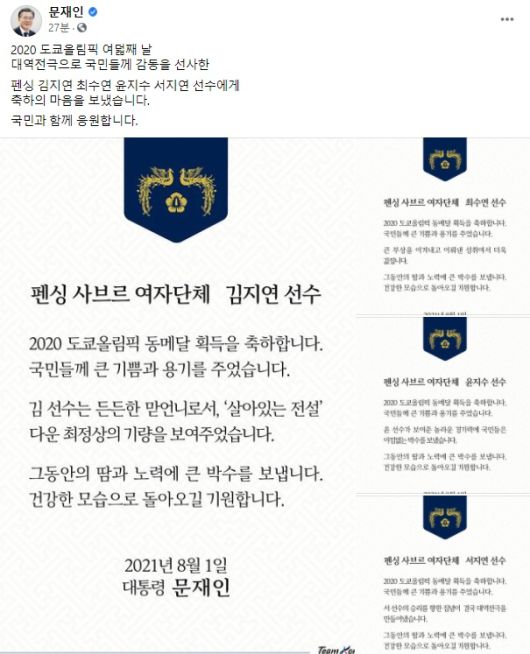 문 대통령은 1일 본인의 페이스북·트위터·인스타그램 등 SNS(사회관계망서비스)에 이같이 밝히며 "김지연 최수연 윤지수 서지연 선수에게 축하의 마음을 보냈다"고 했다.