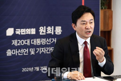 원희룡 제주도지사가 25일 오전 서울 여의도 하우스 카페에서 비대면 방식으로 진행된 제20대 대통령 선거 출마 선언을 마치고 진행된 기자간담회에서 취재진의 질문에 답변하고 있다.(사진=방인권 기자) |