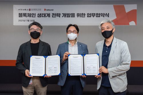 빗썸-서강대, 블록체인 생태계 전략 개발 위한 업무협약안용운(왼쪽부터) 빗썸 최고기술책임자(CTO), 박수용 서강대 지능형 블록체인 연구센터장, 윤석빈 서강대 교수가 협약 후 기념촬영을 진행하고 있다. [빗썸 제공. 재판매 및 DB 금지] ▲ 가상화폐 거래소 빗썸은 서강대와 블록체인 생태계 개발을 위한 기술이전 협약을 했다고 2일 밝혔다. 블록체인 생태계 공동 개발은 서강대 산학협력단 산하 지능형 블록체인 연구센터를 중심으로 진행될 예정이다. (서울=연합뉴스) <저작권자(c) 연합뉴스, 무단 전재-재배포 금지>
