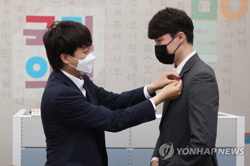 양준우 대변인에 당 배지 달아주는 국민의힘 이준석 대표 |