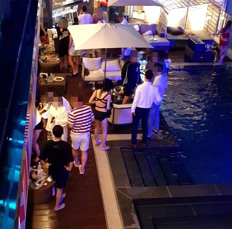 피서 절정기를 맞아 지난달 31일 저녁 강원 강릉시의 한 호텔에서 수십 명이 참가한 풀 파티가 진행되고 있다. 강릉시는 1일 이 호텔에 대해 영업정지 명령을 내렸다. [강릉시 제공] |