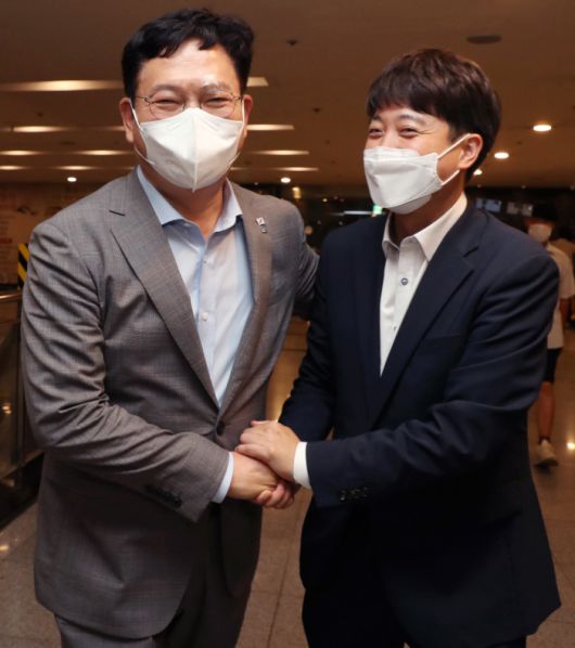 더불어민주당 송영길 대표(왼쪽)와 국민의힘 이준석 대표가 지난달 12일 서울 여의도의 한 식당에서 만찬 회동을 마친 후 인사하고 있다. 연합뉴스 |