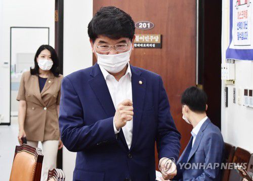 원내대책회의 입장하는 민주당 박완주 정책위의장 |