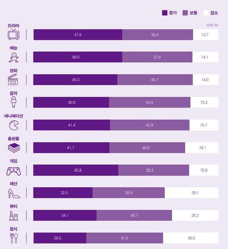 소비량이 증가했다는 응답을 부문별로 보면 예능이 48.0%로 가장 높았고, 드라마(47.9%), 게임(45.8%), 영화(45.3%) 등의 순이었다.