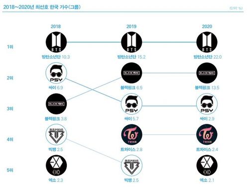 2019년과 지난해 1∼4위 순위는 같았지만, 방탄소년단과 블랙핑크의 비중은 각각 약 7%포인트 증가했으며 싸이와 트와이스의 비중은 줄었다.