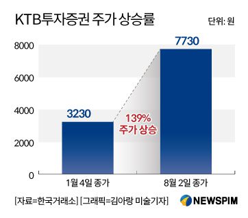 3일 한국거래소에 따르면 KTB투자증권의 올해 주가 상승률은 139%나 올랐다. 지난 1월 4일 종가기준 1주당 3230원이던 주가는 전날 종가 7730원을 찍으며 2배이상 뛰었다. 국내 증권사 가운데 주가 수익률은 단연 1등이다.
