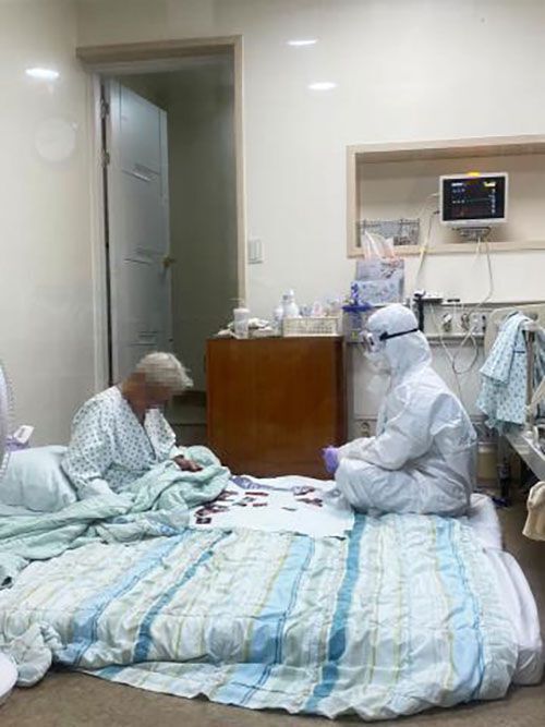 코로나19 병동에 배치된 10여 명의 간호사는 할머니가 병실 침대를 꺼리고 낙상 위험이 있어 병실 바닥에 매트리스를 깔았습니다.