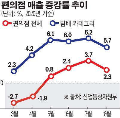 지난해의 경우 올 초부터 불어닥친 코로나 19 여파에 지자체가 할인 상품권을 풀고 정부가 재난지원금을 지원하면서 담배에 수요가 몰렸다. 통상 2~3%대를 차지하던 편의점의 담배 매출 상승률은 지난지원금 사용이 가능했던 지난해 5월부터 8월까지 6% 내외의 신장률을 보였다. 온라인에서는 판매하지 않고 대형마트와 가격이 같은데다 장기 저장이 가능하기 때문이다.